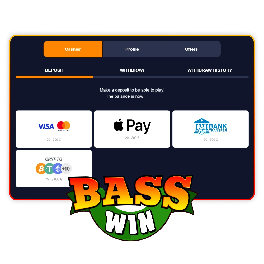 UK players can use debit cards, e-wallets, Apple Pay, Google Pay, and bank transfer for a Basswin deposit. No commission is charged on deposits. The minimum deposit is £10 and the maximum is £5,000 per transaction. Most payments are instant. Crypto is not available for UK accounts.